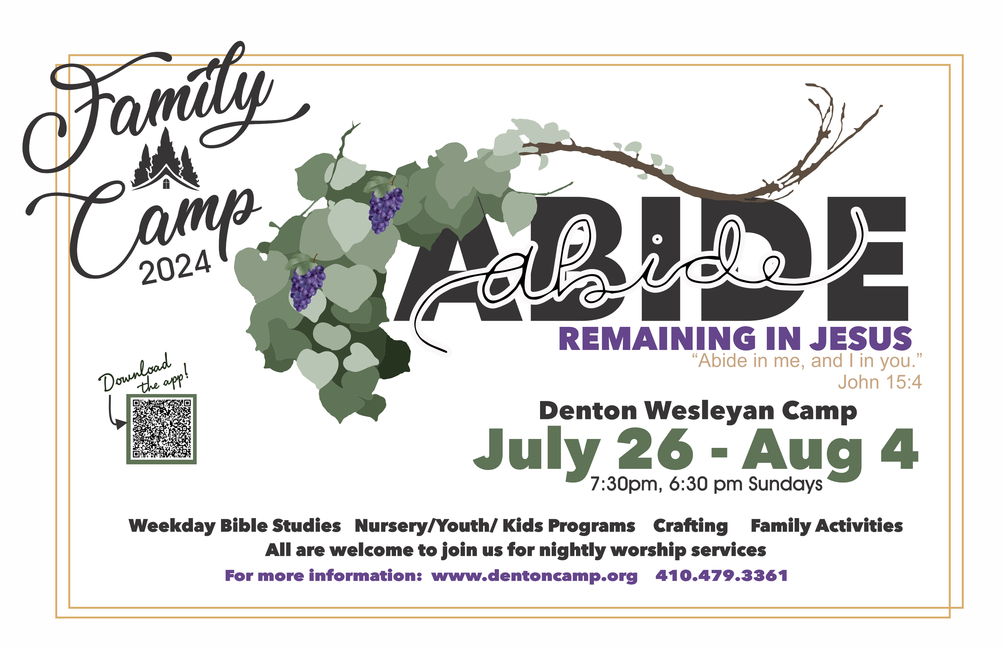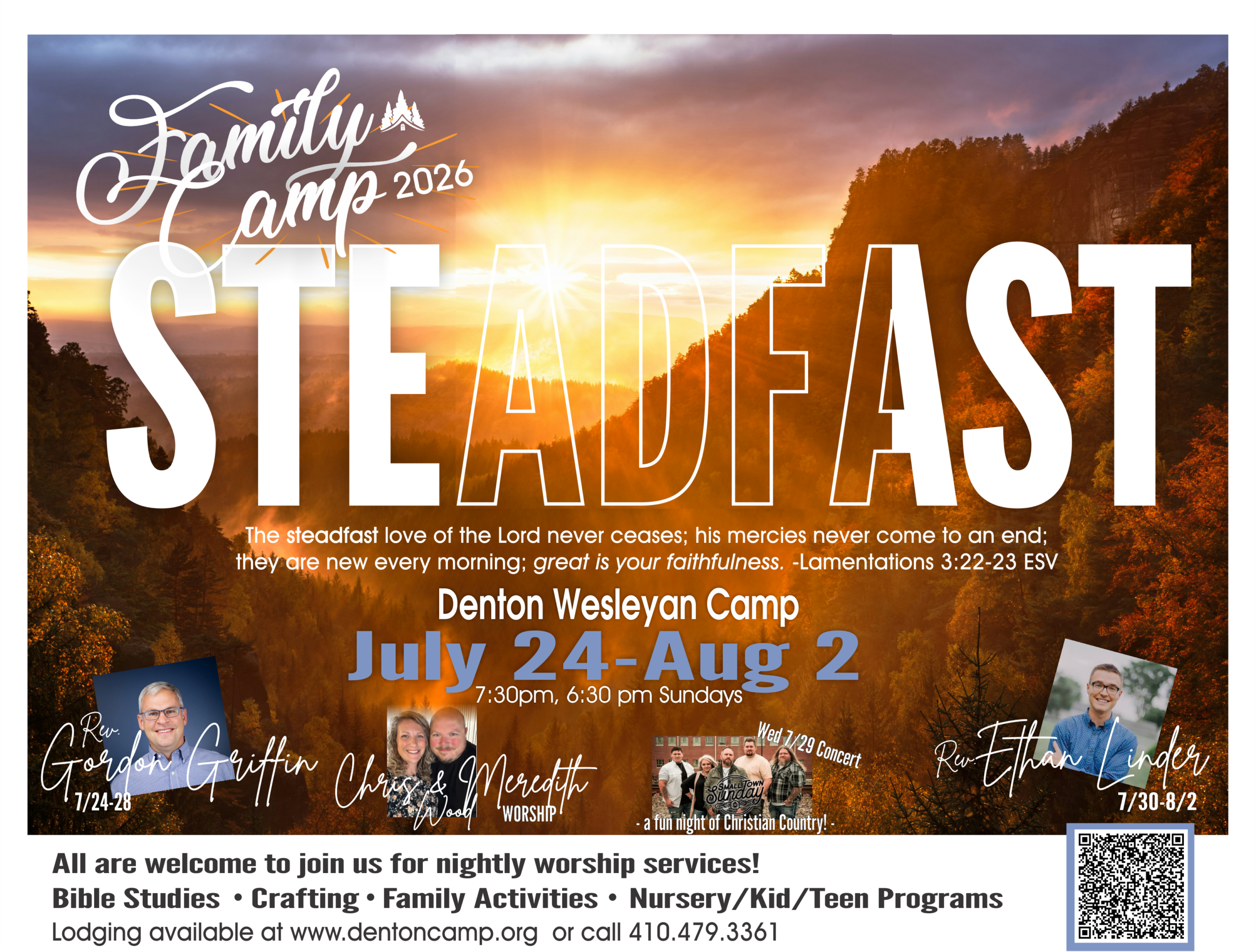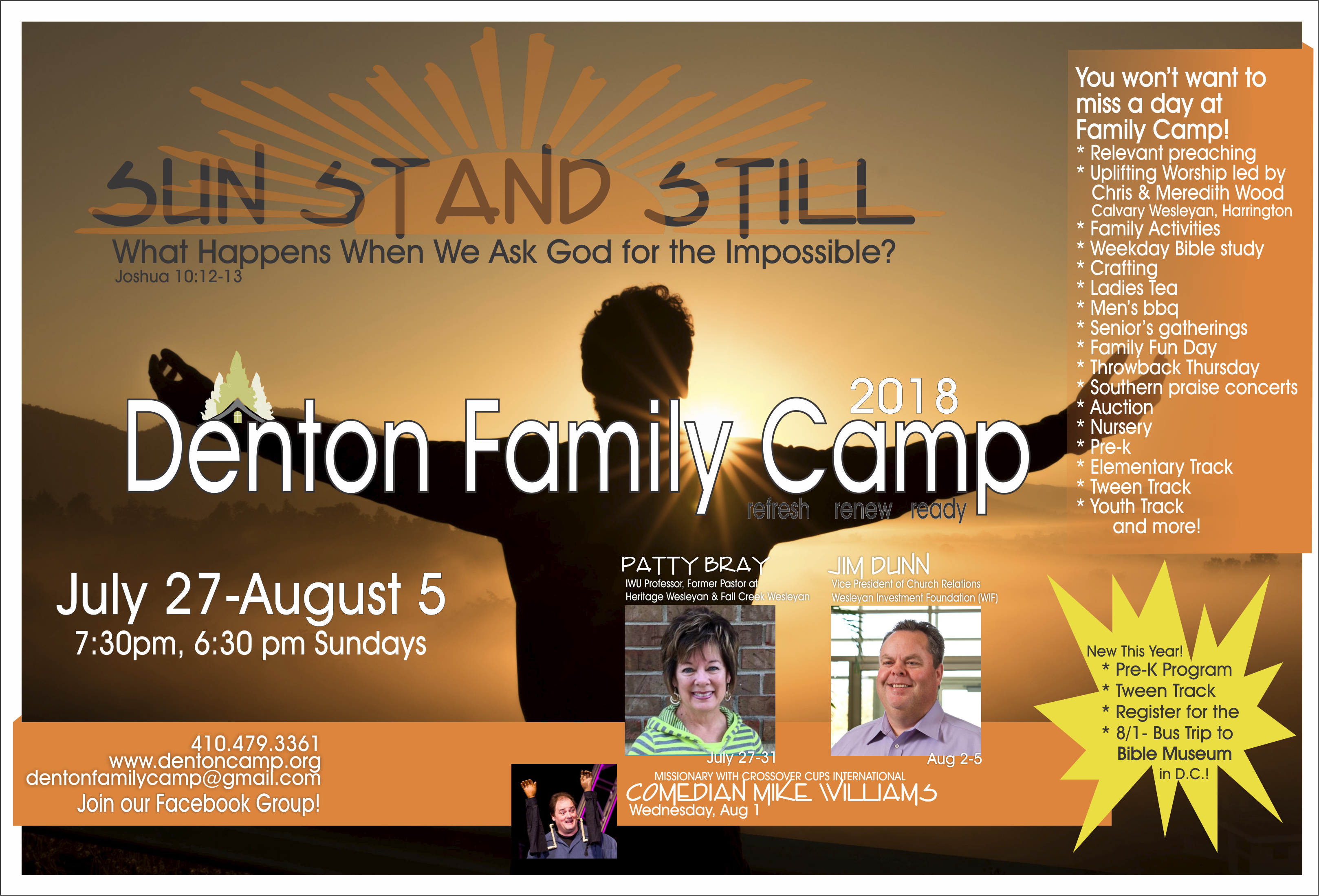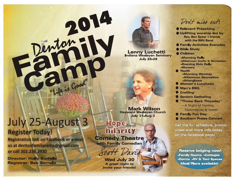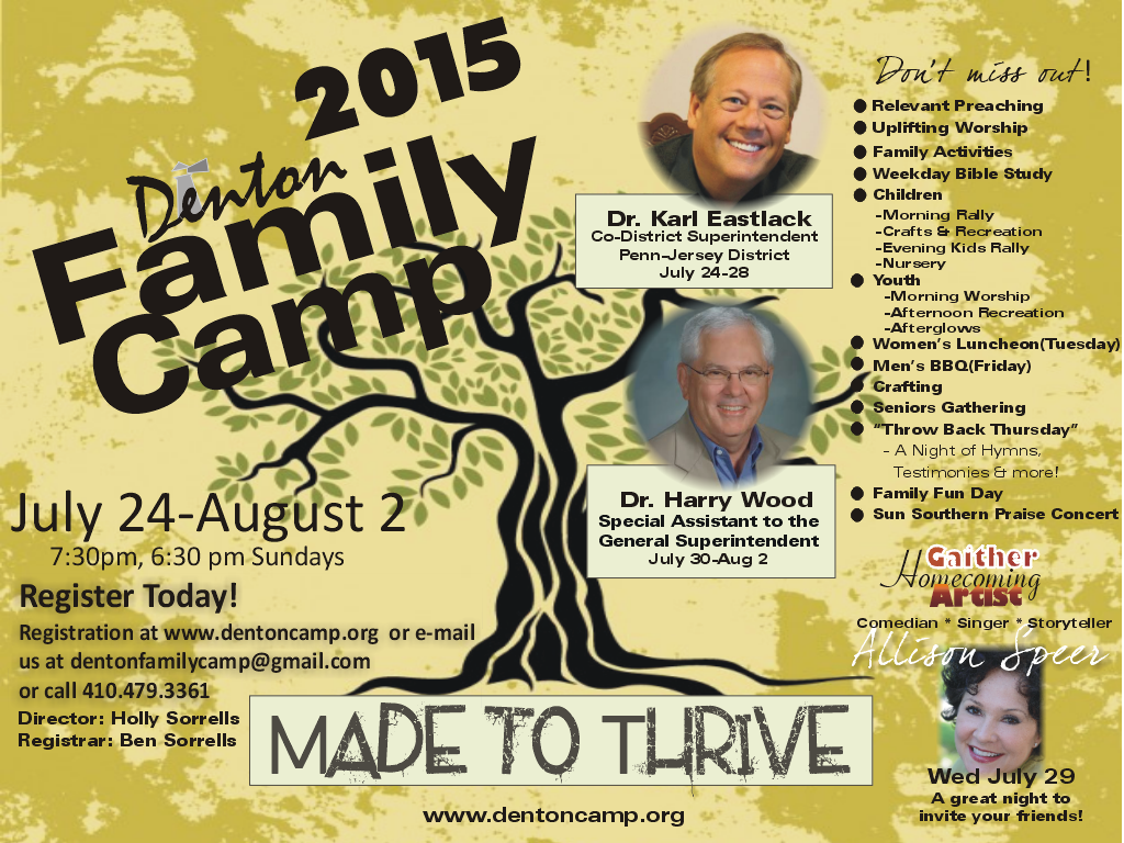 FAMILY CAMP Schedule to come soon!Menu to come soonLive Stream Link Get the App! Register BaptismLooking to serve? We have positions in the dining hall, children, nursery, snack shop, and more! VolunteerSee what the app can do! Talent Night Signup Let's Make A Deal Signup PAST CAMP HIGHLIGHTS 2023 2022 2021 2019 2018 2017 2016 2015 2014 2013